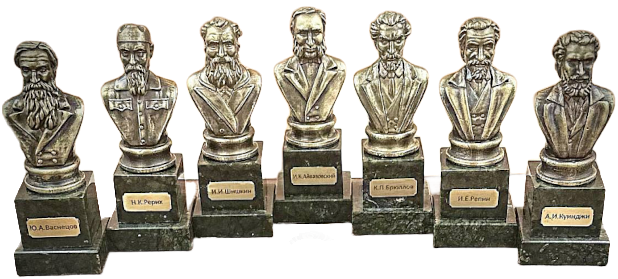 Коллекция «Великие русские художники» представляет собой тщательно отобранную группу миниатюрных бронзовых бюстов, каждый из которых является портретной интерпретацией выдающихся мастеров русской живописи. В рамках этой коллекции представлено семь скульптурных изображений: Карла Брюллова, Ивана Айвазовского, Ивана Шишкина, Архипа Куинджи, Ильи Репина, Виктора Васнецова и Николая Рериха.